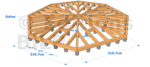 Comme les solives ne sont pas porteuses, il faut mettre des supports au sol à chaque intersections. Mesurer ensuite les distances entre ces supports pour avoir les portées des solives. Si vous ne voulez pas utiliser beaucoup de plots comme celui-ci, il faut utiliser des poutres porteuses sous les solives de façon à ce que le même principe soit maîtrisé.