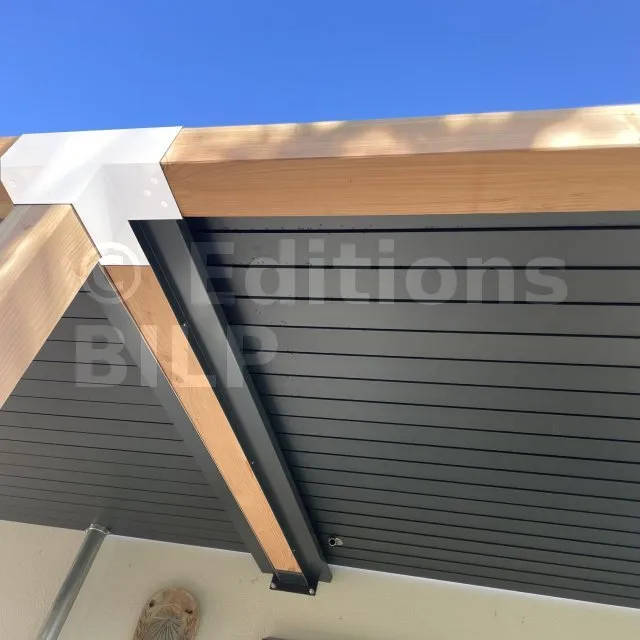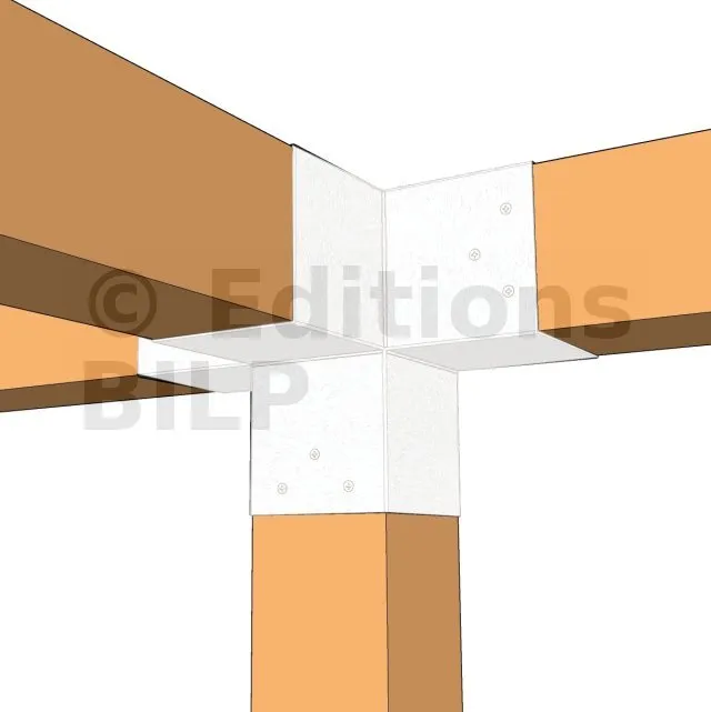 Il permet de raccorder une poutre de 120x120mm perpendiculairement à un chevron de 120x120mm, le tout étant supporté par un poteau vertical de 120x120mm.