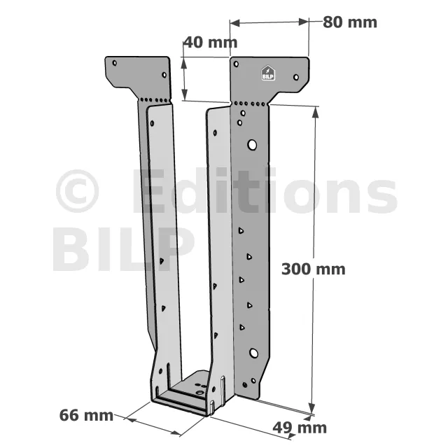 - Étrier fourni avec ses brides supérieures droites, pliables sur chantier afin de s’adapter à toutes les hauteurs de solives,
