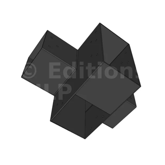 Il permet de raccorder deux poutres 120x120mm perpendiculairement à une grosse poutre 240x120mm, le tout étant supporté par un poteau vertical 120x120mm.