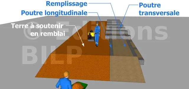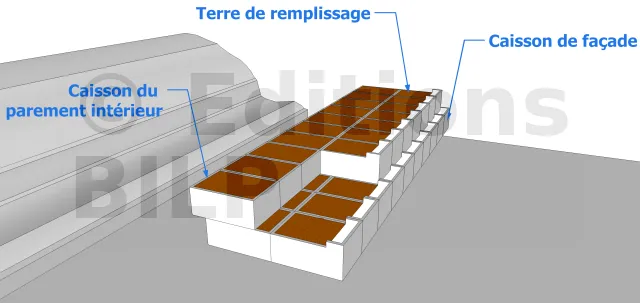 La mise en oeuvre de ce mur est similaire à celle du mur en poutres empilées. En effet,il suffit de disposer la première assise de caisson sur la plateforme préalablement préparée. Puis vous allez remplir les caissons de terre qui vont recevoir les végétations sur la façade apparente. L’appareillage des autres assises se dérouleront de la même manière. Pour faciliter l’appareillage des assises, le remblais doit être mis en place au fur et à mesure que le mur monte. Ce type de mur nécessite la mis en place d’un système de drainage constitué de sable, de gravillon, de cailloux et de gros pierre.