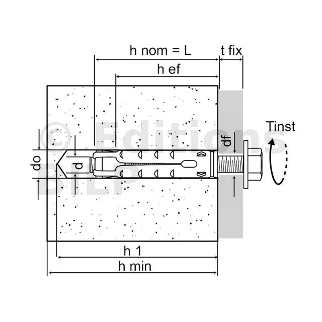 | Références | Référence | Ø perçage [d0] [mm] | Prof. min. de perçage [h1] [mm] | Ø perçage dans pce à fixer (au travers) [df] [mm] | Couple de serrage [Tinst] [Nm] | Prof. ancrage [hef] [mm] | Ep. mini du support [hmin] [mm] |