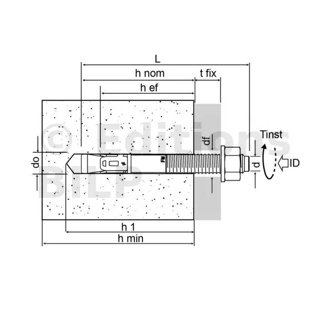 | Références | Dimensions [ØxL] | Ø perçage [d0] | Prof. mini de perçage [h1] | Ø perçage dans pce à fixer [df] | Ouverture de clé sur plat [SW] | Couple de serrage [Tinst] | Profondeur d’ancrage [hef] | Ep. mini du support [hmin] | Distance entraxes caractéristique(5) [Scr,N] [mm] | Distance au bord caractéristique [ccr,N] [mm] | Distance entraxes mini [Smin] [mm] | Distance au bord mini [Cmin] [mm] |