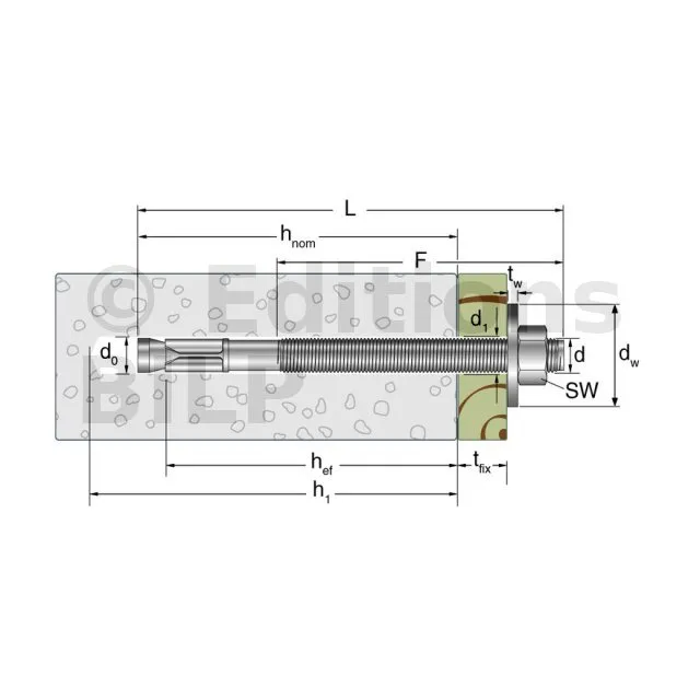 - Pose simple et rapide : écrou et rondelle prémontés et profondeur d’ancrage réduit ; Ø du filetage = Ø du perçage,