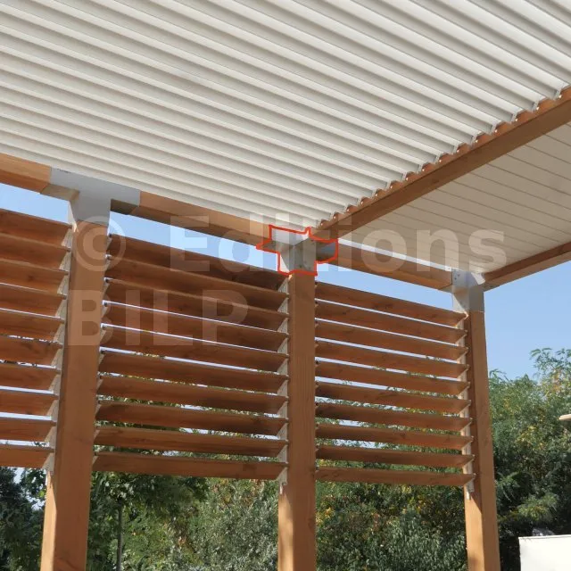 Il permet de raccorder une poutre de 120x120mm perpendiculairement à un chevron de 120x120mm, le tout étant supporté par un poteau vertical de 120x120mm.