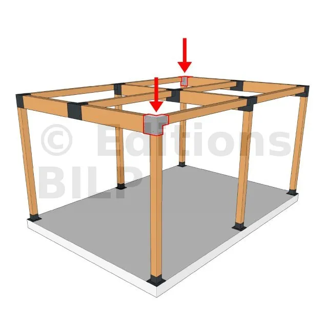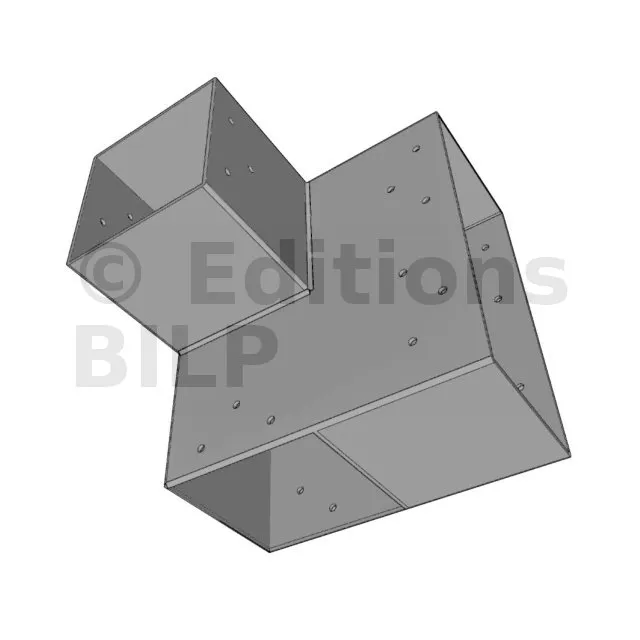 Il est utilisé dans un angle extérieur. Ce connecteur va permettre de raccorder une grosse poutre 240x120mm perpendiculairement à une poutre 120x120mm, le tout étant supporté par un poteau vertical 120x120 mm.