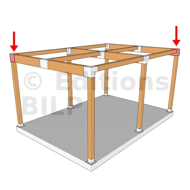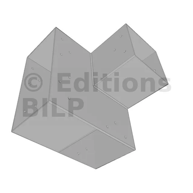 Il est utilisé dans un angle extérieur. Ce connecteur va permettre de raccorder une grosse poutre 240x120mm perpendiculairement à une poutre 120x120mm, le tout étant supporté par un poteau vertical 120x120mm.