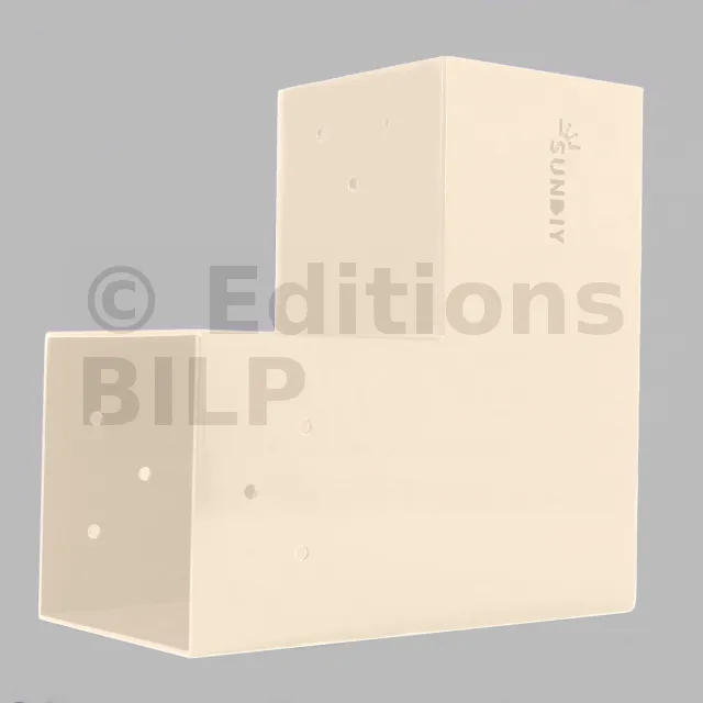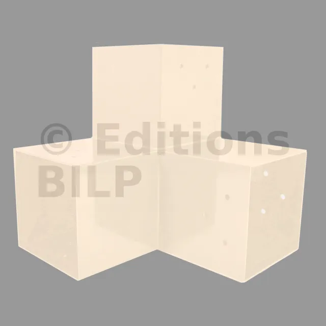 Il est utilisé dans un angle extérieur. Ce connecteur va permettre de raccorder une grosse poutre 120x120mm perpendiculairement à une poutre 120x120mm, le tout étant supporté par un poteau vertical 120x120mm.