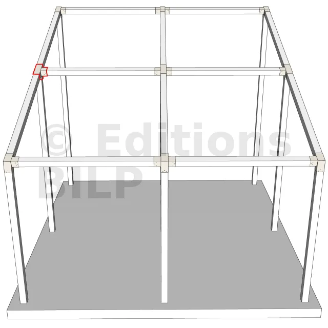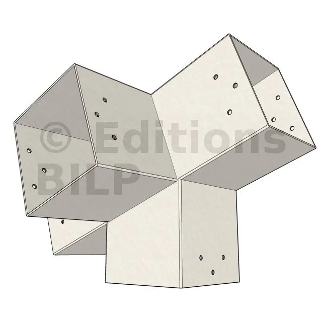 Connecteur d’angle intérieur à quatre directions, conçu pour l’assemblage de deux poutres en section 120x120 mm formant un angle de 20° avec un poteau vertical de même section. Il assure une liaison structurelle rigide et orthogonale à mi-hauteur, garantissant la stabilité de l’ensemble.