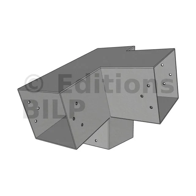 Il est utilisé dans un angle extérieur. Ce connecteur va permettre de raccorder une poutre 120x120mm à une poutre 120x120mm avec une pente de 20°, le tout étant supporté par un poteau vertical 120x120mm.