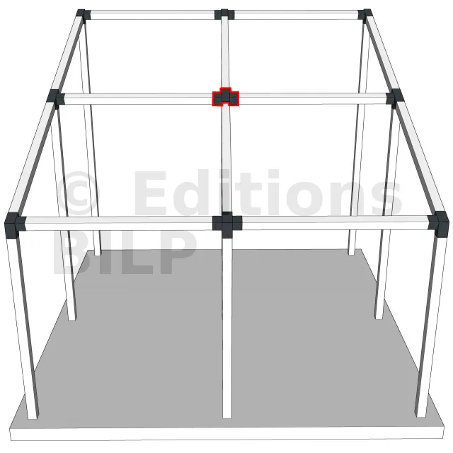 Connecteur métallique permettant l’assemblage précis de deux chevrons inclinés à 20°, de deux poutres horizontales et d’un poteau vertical central, tous de section 90x90 mm. Il garantit une liaison rigide et symétrique en un point central, assurant la stabilité de l’ensemble de la structure.