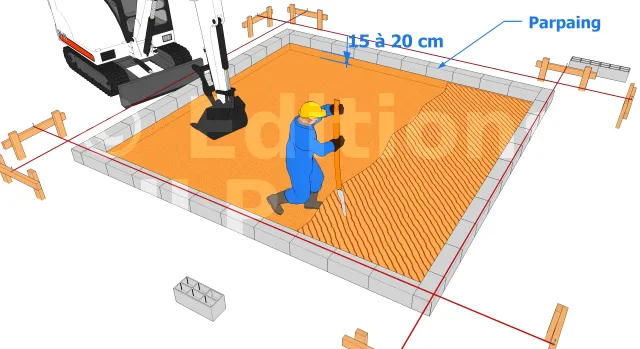 Après avoir délimité la surface, il vous faudra poser les parpaings aux alentours. La hauteur du parpaing sera alors la hauteur de la dalle du futur abri de jardin. Par la suite, il sera nécessaire de creuser la surface délimitée par les parpaings sur une profondeur de 15 à 20 cm en dessous du niveau du sol. Suite à quoi, les abords ainsi que les fonds de fouille seront nettoyés.