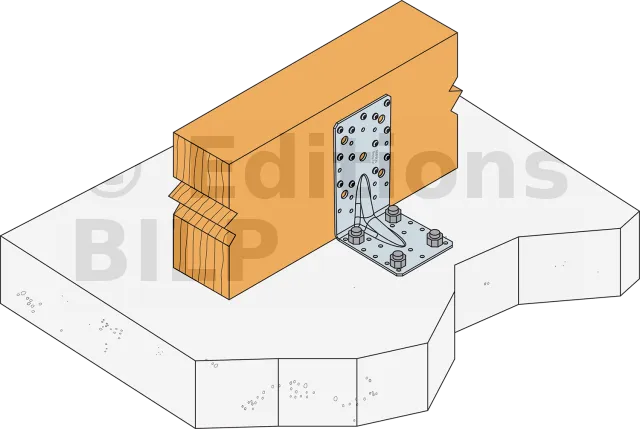 Le niveau de résistance design du boulon R#,d est déterminé par (coefficient boulon x charge design du connector F#,d) pour la direction d’effort et fixations correspondantes. Referez vous à la gamme d’ancrages Simpson Strong-Tie pour les ancrages adaptés. Les solutions classiques sont BOAXII, SET-XP, WA, AT-HP, en fonction du type de béton, espacement et distances aux bords.