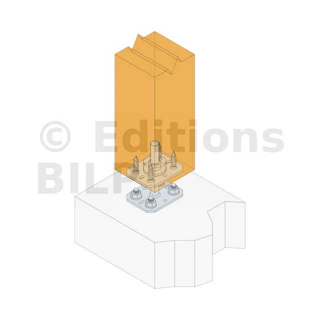 2. Fixer cette platine au poteau à l’aide de tirefonds LAG ou SSH Ø8x40 (pré-perçage nécessaire)