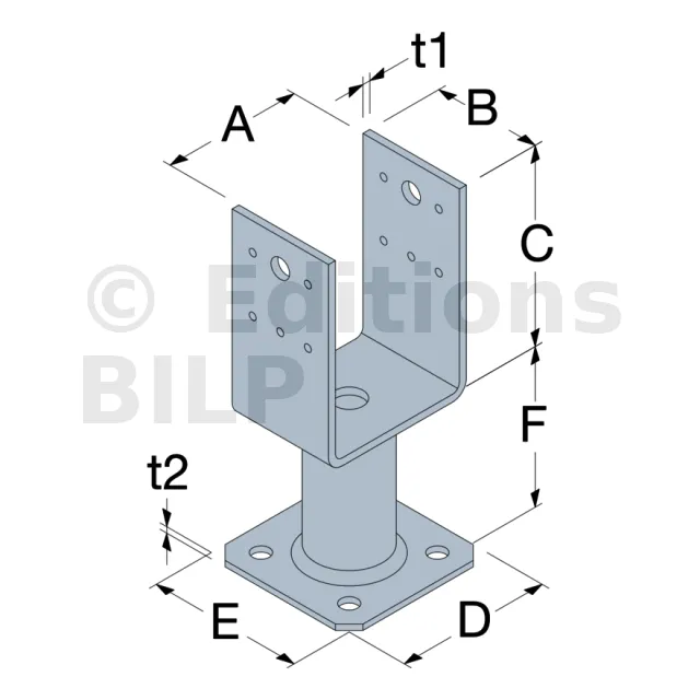Ce pied de poteau en U avec platine permet de fixer un poteau sur une dalle béton tout en résistant à des efforts dans les 4 directions.