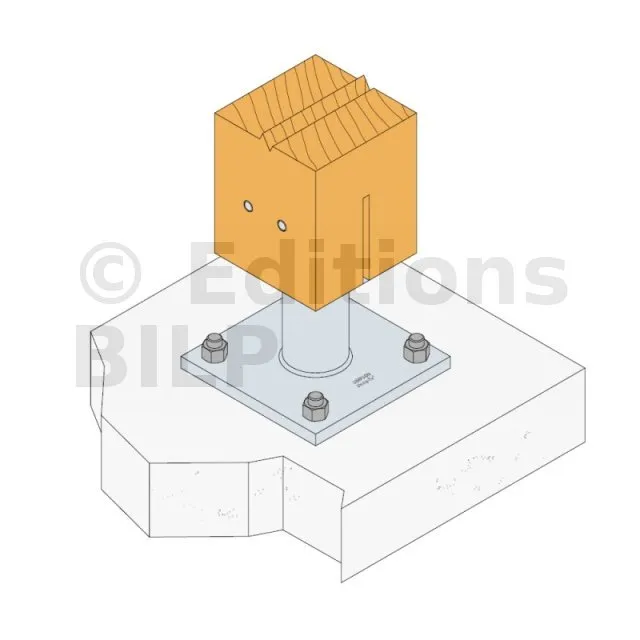 Le pied de poteau PISBMAXIG-K permet une reprise de charge en compression jusqu’à 9 tonnes en valeur design ainsi que des efforts de soulèvement grâce à son âme verticale. Il doit être boulonné sur un support rigide de type béton. Il est proposé en kit avec quatre goujons WA M16-151/30.