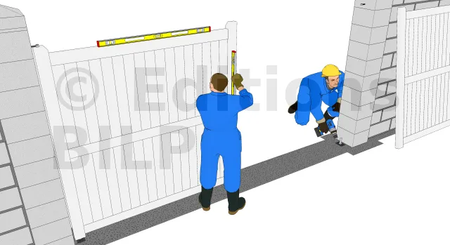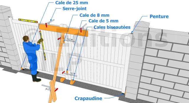 Régler la hauteur des vantaux par le biais des cales biseautées tout en vérifiant le réglage d’aplomb et la verticalité grâce aux cales biseautées que vous allez fixer entre le portail et les piliers.