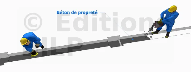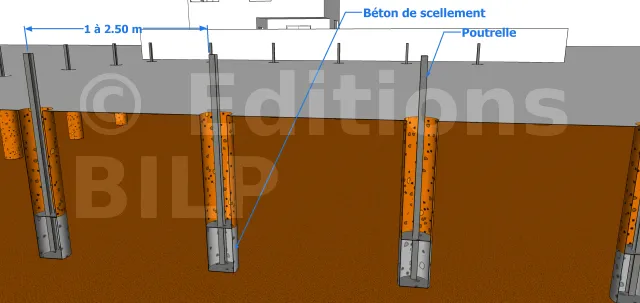 Une fois les trous réalisés, du béton sera coulé dedans pour sceller les poutrelles ; les poutrelles sont alors mises en place pendant que le béton est encore frais pour faciliter le réglage de celle-ci (alignement et aplomb). Elles seront placées à une distance régulière de 1 à 2,5 m.