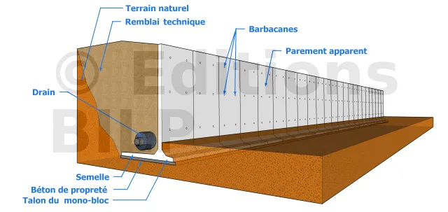 - Un système de drainage comprenant généralement des barbacanes, des couches de granulats de finesse (caillou, gravillon, sable) qui recouvreront un buse en béton poreux évacuant les eaux vers un puits ou un système d’évacuation d’eau pluvial.