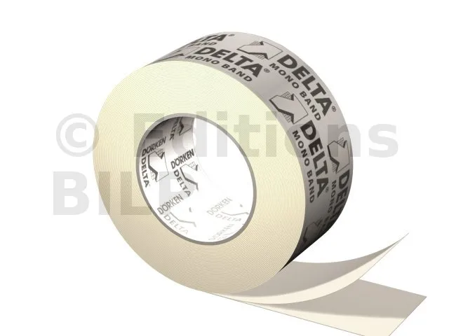 Les feuilles à assembler doivent être posées et fixées sans tensions ni plis et les recouvrements intégralement collés sans tensions ni contraintes de cisaillement ou de pelage. La température du support doit être supérieure à + 5 °C. La bande adhésive doit être tempérée avant utilisation. Il faut s’assurer qu’aucune contrainte n’apparaisse après le collage, par exemple à la suite de la Mise en œuvre d’un lattage sous un pare-vapeur pour éviter un affaissement. Le collage optimal est obtenu lorsqu’une pression homogène est exercée sur la bande adhésive à l’aide d’accessoires adaptés, par exemple un rouleau à maroufler. Ne pas coller sur des parties qui resteront visibles DELTA®-MONO-BAND ne pourrait plus que difficilement décollée.