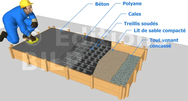Si vous ne disposez pas encore d’une dalle en béton ou d’une terrasse en béton où vous souhaiterez installer votre barbecue, il vous faudra en réaliser une. Pour ce faire, il vous faudra creuser, mettre en place le coffrage, le fond de forme en gravier, le film pare-vapeur, le ferraillage (ceinturage et treillis soudé) puis couler le béton et le lisser etc. Pour découvrir toutes les étapes nécessaires en détail, nous vous invitons à consulter l’article sur la réalisation d’une dalle en béton.