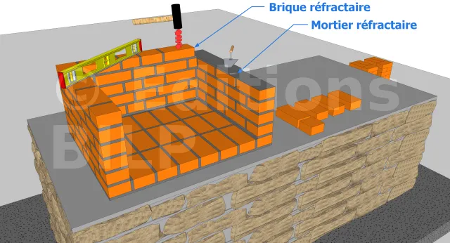 - Mettre en place les briques réfractaires constituant le plancher du foyer