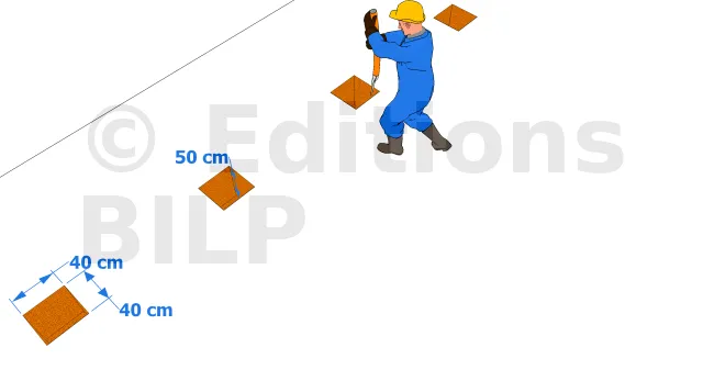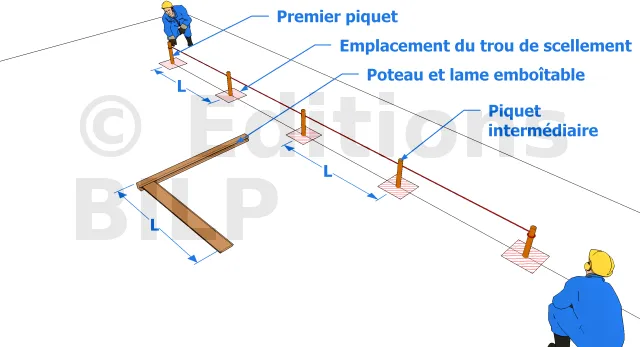 Afin de déterminer l’emplacement des trous de scellement intermédiaire, vous devrez placer au sol un poteau et y emboîter une lame pour mesurer la distance exacte qu’il faudra reporter entre chaque scellement. Pour la matérialiser au sol, à partir du premier piquet, vous allez reporter cette mesure tout en respectant l’alignement du cordeau. Puis, vous y placerez des piquets à chaque fois pour servir de repère, matérialisant le centre de l’emplacement des autres trous de scellement.