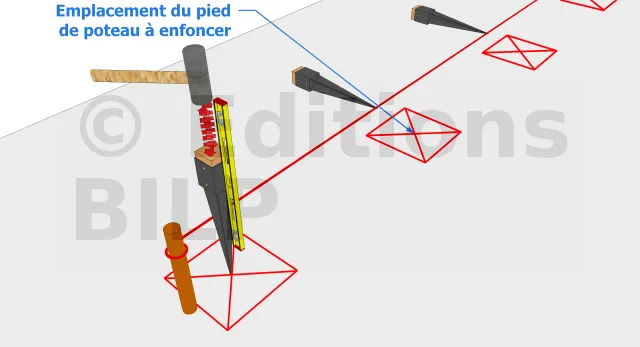 - Vérifiez au fur et à mesure la verticalité et l’alignement du pied (avec le plomb) car il sera difficile de le rectifier après un certain enfoncement dans le sol.