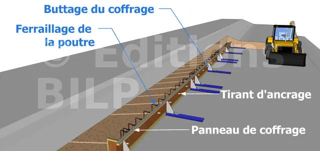 Le coffrage est composé de panneaux (bois ou métallique), ces panneaux sont assemblés à l’aide de chevrons ou de bois carrés comme dans l’image ci-contre. Le buttage des panneaux est nécessaire pour éviter les déformations de la poutre, en effet lors du coulage du béton, le coffrage sera soumis à des efforts dus notamment au processus de vibration et à la pression du béton. Il sera assuré par les fers à joints, par des bois ronds ou de chevrons, ou autre. Voir Le coffrage - Le bétonnage :
