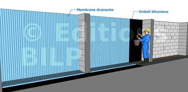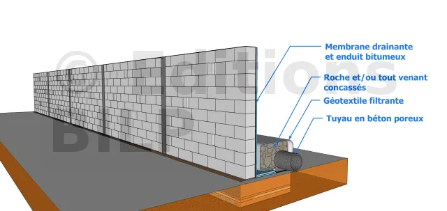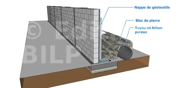 La nappe de géotextile filtrante est le premier élément à mettre en place : elle est placée à la fois sur le sol, la semelle de fondation et contre la membrane drainante. Elle aura pour rôle de filtrer les eaux accumulées dans le remblai. Après cette opération, le tuyau ou la buse en béton poreux est mis en place et sera entouré de blocs pierres et de tout-venant concassé, qui seront à leur tour enveloppés par la nappe de géotextile.