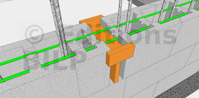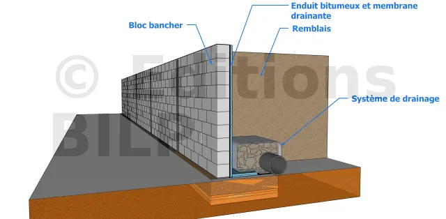 Pour les murs en blocs à bancher, les barbacanes sont réalisées en faisant des réservations entre deux blocs d’extrémités. Comme les blocs à bancher sont creux, il est nécessaire de fabriquer des coffrages en bois.