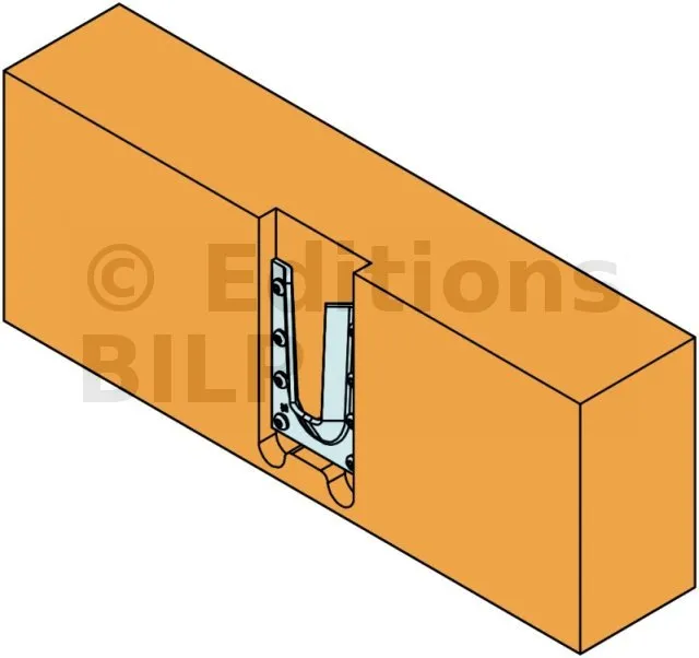 L’étrier à queue d’aronde en acier ETSN est un connecteur innovant et très discret. Il permet de reproduire l’esthétique d’un assemblage traditionnel à queue d’aronde. La partie femelle est placée sur la poutre porteuse avec des vis CSA ou des pointes CNA, tandis que la partie mâle est fixée à l’extrémité de la poutre portée avec les vis à tête plate.