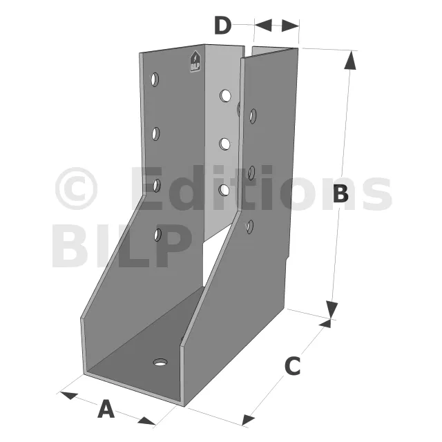 Attention, pour les sabots SAIX à ailes intérieures de largeurs inférieures à 80 mm, les ailes sont recoupées sur la hauteur dans l’axe des perçages de boulons. La fixation sur le porteur est donc uniquement possible par pointes ou vis dans la ligne verticale de perçages Ø5 proche du pli.