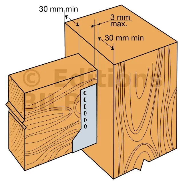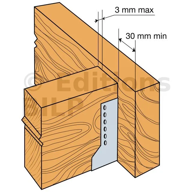 Attention, pour les sabots SAIX à ailes intérieures de largeurs inférieures à 80 mm, les ailes sont recoupées sur la hauteur dans l’axe des perçages de boulons. La fixation sur le porteur est donc uniquement possible par pointes ou vis dans la ligne verticale de perçages Ø5 proche du pli.