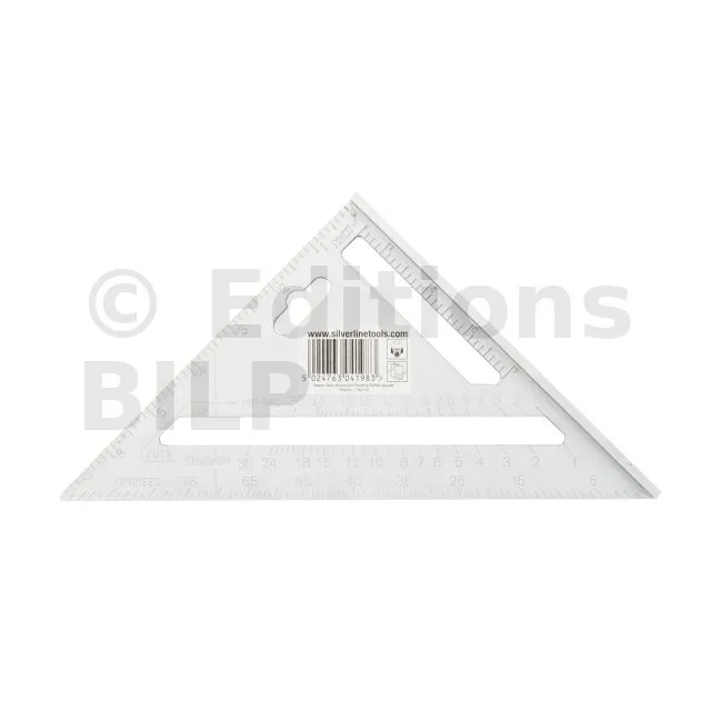 Équerre à corps robuste en alliage d’aluminium moulé, graduations impériales en relief faciles à lire, et table de conversion pour la pose de chevrons. À bords relevés pour une localisation sure. Échelle de rapporteur 0-90°. À utiliser comme guide lors du sciage pour les mesures d’angle et les coupes. Poids 125 g. Dimensions : 185 x 185 x 260 mm.