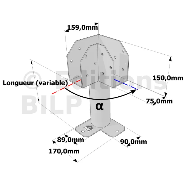 Poteau structurel OSP - D89mm - Platine haute en L 75x159x150mm - Embase en angle 90x170mm