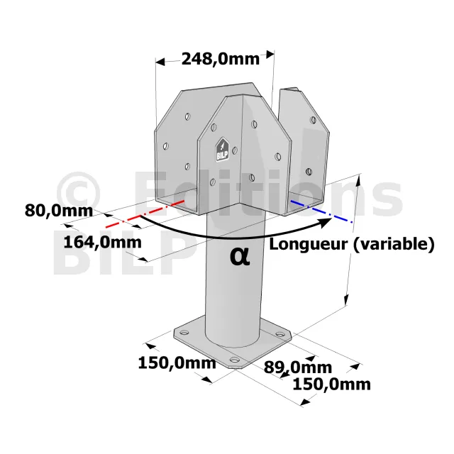 Poteau structurel OSP - D89mm - Platine haute en T 80x164x150mm - Embase 150x150mm