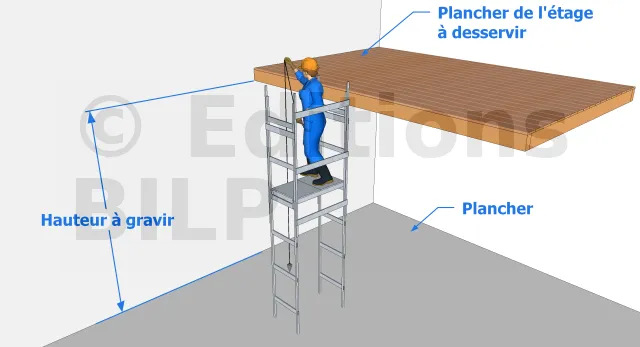 - Dimensionnez l’escalier : définir sa largeur , le nombre de marche, leur profondeur, leur hauteur, leur longueur en gardant la hauteur de l’échappée toujours supérieure à 1,90 m.