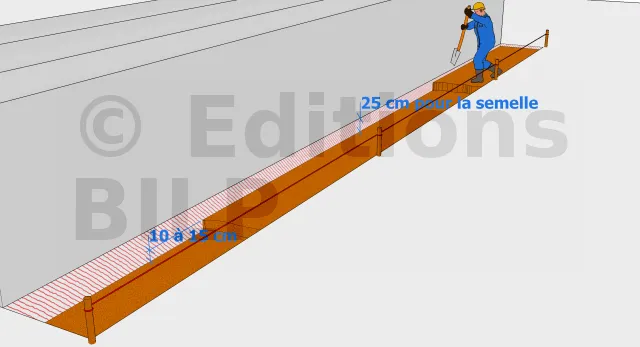 Selon votre cas et en suivant les illustrations dans les armatures à employer , vous allez creuser à une profondeur correspondant à l’épaisseur de la semelle en y ajoutant 10 à 15 cm pour la mise en place du tout-venant concassé, du lit de sable et du béton de propreté.