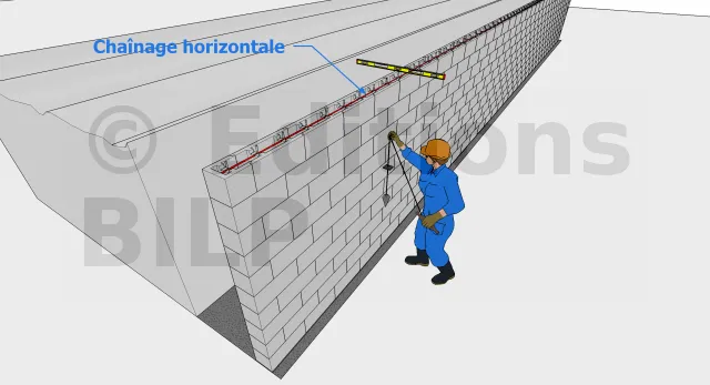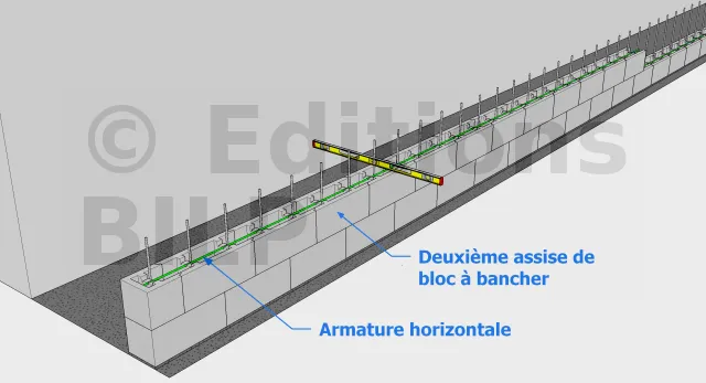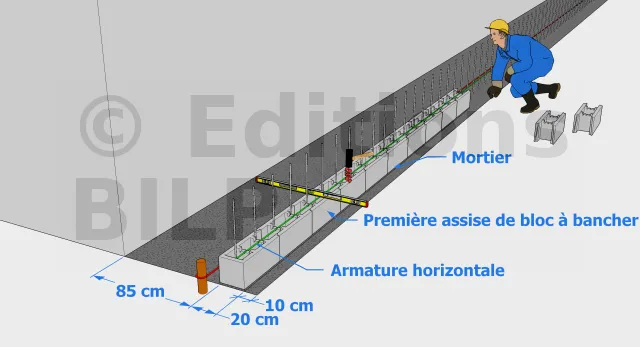Une fois que la semelle a durci, vous pouvez y monter les premiers éléments de blocs à bancher en les intercalant entre les armatures verticales. Pour ce faire, il faudra commencer par y étaler du mortier aux alentours du leur emplacement et bien le caler à niveau et vérifier son alignement par rapport au cordeau. Pour qu’il soit bien en place, il faudra bien le tapoter à l’aide d’un maillet. Il ne faut pas hésiter à les repositionner si nécessaire pour garantir l’alignement et l’esthétisme de votre mur de soutènement. Par la suite, vous allez mettre les armatures horizontales correspondantes sur les premiers blocs à bancher.