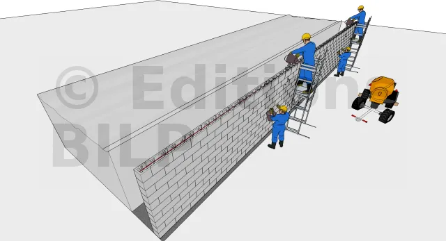 C’est une étape fastidieuse car la quantité de béton peut être très importante, et il faut porter les seaux en hauteur pour les déverser dans les blocs. Le recours à une pompe à béton soulage d’un grand effort.