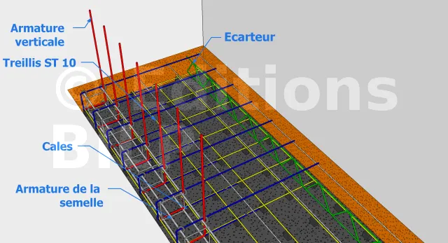Toujours en suivant les indications données par les tableaux et selon votre cas, vous allez mettre en place les armatures de la semelle ainsi que les armatures verticales de la paroi des murs de soutènement.
