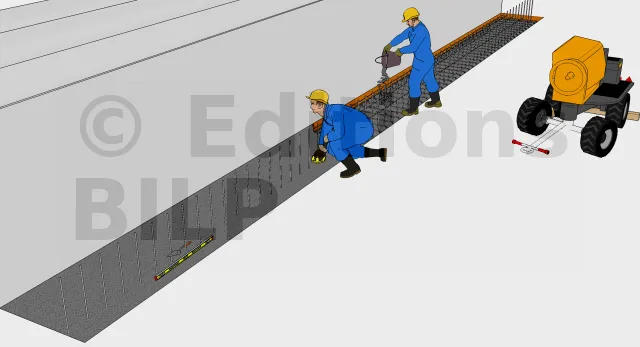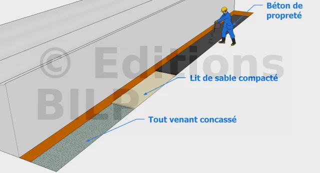 Le tout-venant concassé aura le rôle de couche de base et garantira la stabilité de l’ouvrage. Le lit de sable comblera les vides dans le tout-venant concassé préalablement compacté. Par la suite, le béton de propreté est mise en place pour créer une surface de travail propre et plane.