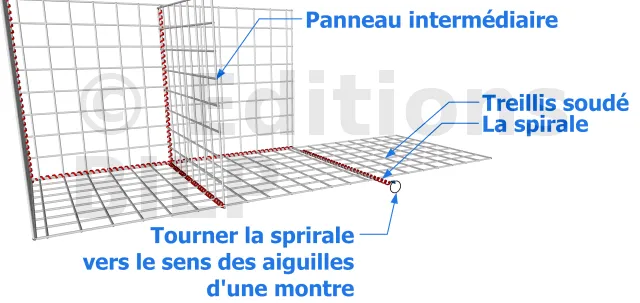 Pour faciliter l’assemblage, vous pouvez commencer par disposer le panneau du fond et les panneaux du devant ainsi que de l’arrière et les deux extrémités sur le sol afin de les assemblés avec les spirales. Il est important de noter qu’il faut mettre en place un panneau intermédiaire tous les mètres au maximum pour éviter les déformations. Une fois que tout est fixé, il faudra que vous leviez les panneaux et que vous réalisiez les ligatures verticales par l’intermédiaire des spirales.