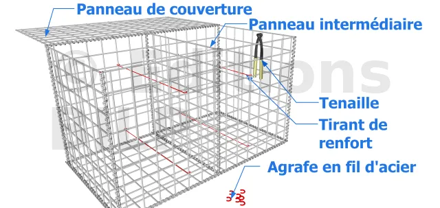 Après avoir mis en place les spirales verticales, vous devriez mettre en place les tirants de renfort avant de remplir la case. Le panneau de couverture devra être agrafé aux panneaux de façades à l’aide d’une tenaille ou d’une pince. Ce dernier pourra être utilisé comme panneau de fond pour l’assise supérieur. Les agrafes devront être en acier galvanisé ou Galfan (alliage aluminium-zinc).