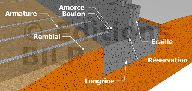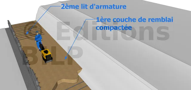 Puis, il vous faudra étaler et compacter une couche de remblai d’une épaisseur de 20 cm à 40 cm sur la plateforme. Pour finir, vous allez placer la première rangée d’armature sur le remblai compacté et la fixer aux amorces à l’aide de boulons.