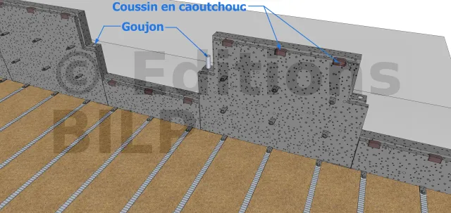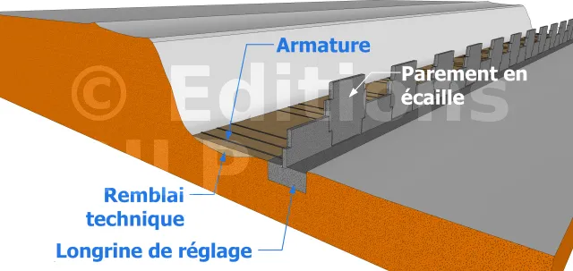 Une fois que le remblai atteint le niveau de la tête d’une assise d’écailles, vous devrez placer l’assise suivante. Les écailles seront fixées entre-elle en les liant par l’intermédiaire d’un goujon ancré dans les manchons. Des coussins en caoutchouc devront être également placés sur la tête des écailles afin d’admettre un léger déplacement et éviter ainsi d’éventuelles fissures.