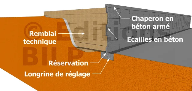 Après avoir préparé le sol d’assise et coulé la longrine de réglage, vous devrez mettre en place le premier lit d’écaille sur la longrine de réglage dans la réservation pour éviter un renversement.