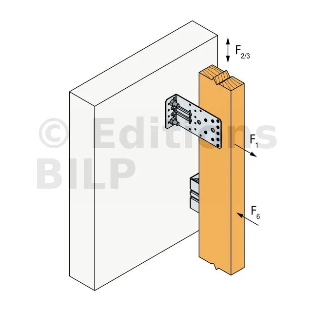 L’utilisateur a la possibilité de fixer l’équerre ABR170 ou ABR220 avec un seul boulon (le supérieur) sur le support et de pouvoir justifier la charge dans les directions F1 et F6. La résistance F1 est dans ce cas divisée par deux.