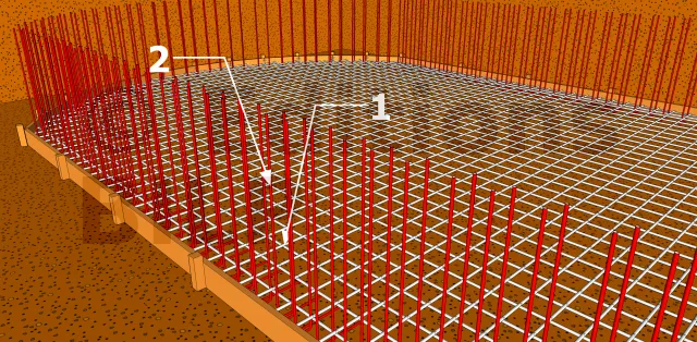 Le ferraillage d’un radier est généralement composé par un treillis soudé (1) mais dans notre cas, des armatures verticales sont nécessaires pour les amorces (2) du ferraillage des blocs à bancher. La disposition des treillis dépend de l’épaisseur du radier (15 à 30 cm selon les prescriptions de l’architecte). Ils peuvent être étalés sur 2 lits avec des armatures écarteurs. Le premier lit est posé sur des cales enrobages. Les amorces seront ligaturées avec du fil de fer sur ce même lit.